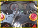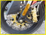 Нельзя не заметить телескопическую вилку с регулировкой гидравлики (как и положено на "спорте"), сзади стандартно - моноамортизатор с преднатягом пружины. Тормоза; задний дисковый вентилируемый тормоз - хороший плюс, а вот спереди установлено целых два тормозных диска с армированными шлангами и радиальными скобами. Бачок с тормозной жидкостью вынесен на руль - это же спортивный мотоцикл!